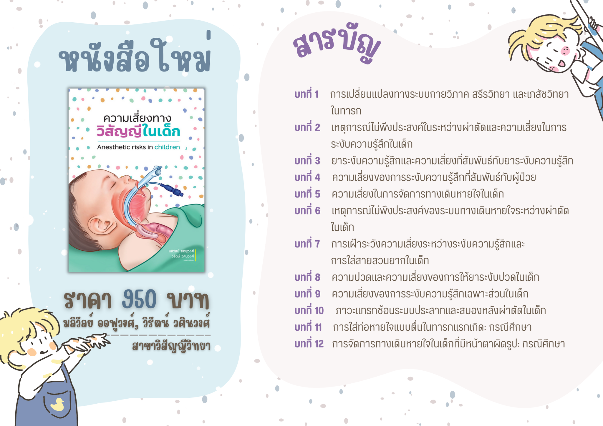 หนังสือ ความเสี่ยงทางวิสัญญีในเด็กเล่มนี้ ผู้เขียนได้จัดทำ????ขึ้นเป็นหนังสือที่เกี่ยวข้องกับผู้ป่วยเด็กเล่มที่สองของสาขาวิชาวิสัญญีวิทยาคณะแพทยศาสตร์ มหาวิทยาลัยสงขลานครินทร์ เนื่องจากความเสี่ยงทางวิสัญญีในเด็กเป็นสิ่งที่มีโอกาสเกิดขึ้นได้ในการระงับความรู้สึกในเด็ก หนังสือเล่มนี้ มีประโยชน์เพื่อให้บุคลากรทางวิสัญญีทุกระดับ ได้แก่แพทย์ใช้ทุน แพทย์ประจำบ้าน แพทย์ประจำบ้านต่อยอด ตลอดจนวิสัญญีแพทย์ทั่วไปมีความตระหนักในเรื่องความเสี่ยงในการให้บริการระงับความรู้สึกในชีวิตประจำวันในผู้ป่วยเด็ก โดยเฉพาะในสถานพยาบาลที่ไม่มีวิสัญญีแพทย์เชี่ยวชาญด้านการระงับความรู้สึกในเด็ก ทั้งนี้ เพื่อบุคลากรทางวิสัญญีทุกระดับ จะได้ศึกษาเป็นแนวทางในการนำไปใช้ลดความเสี่ยงในเด็กที่มารับการผ่าตัดหรือการทำหัตถการ (รศ.ดร.พญ.มลิวัลย์ ออฟูวงศ์,